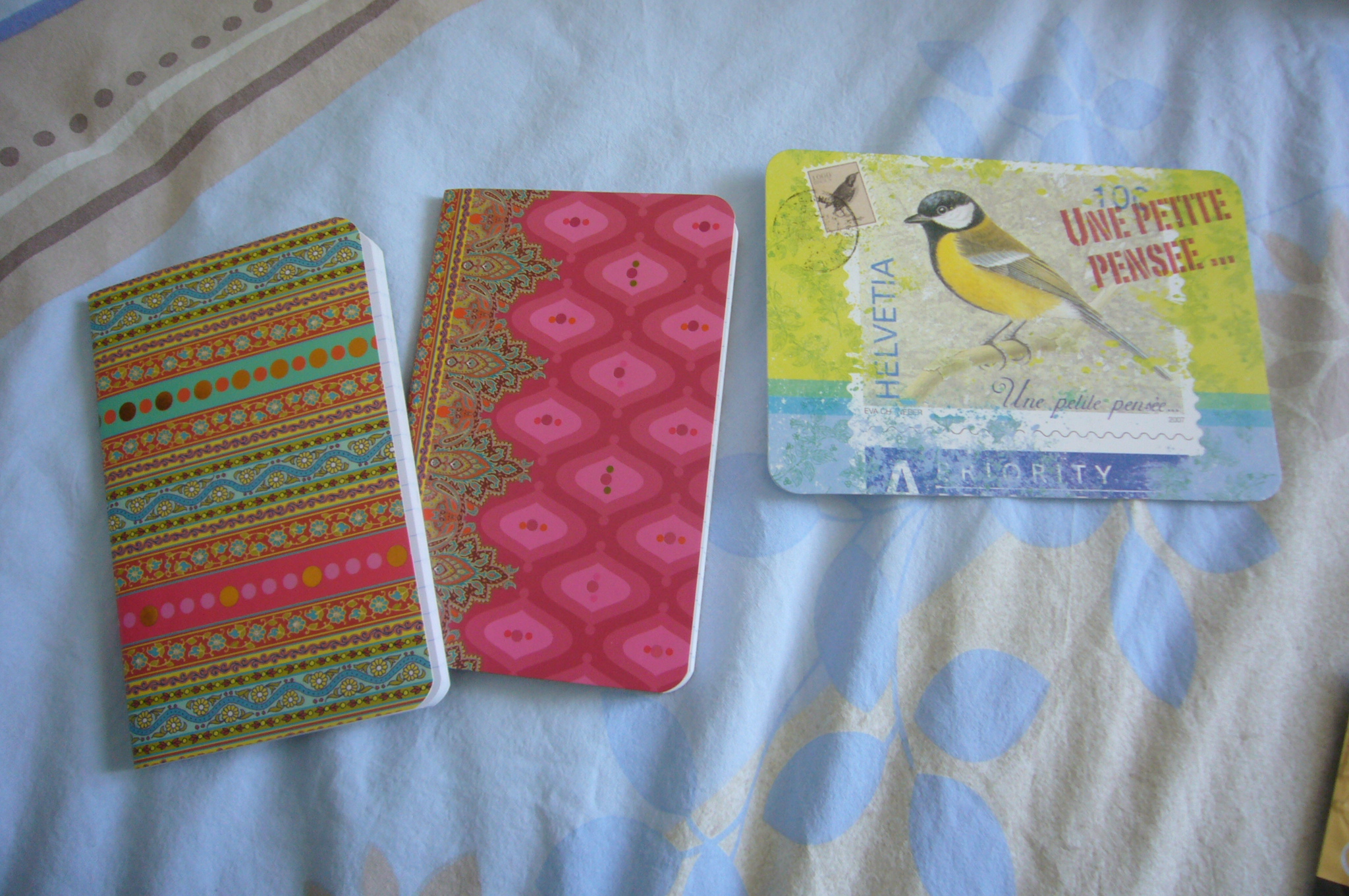 J’ai ensuite découvert, dans mon colis, deux magnifiques petits carnets, dans lesquels je me vois déjà lister mes prochaines lectures, les livres de ma wish-list, et le garder dans mon sac à main lors de mes prochaines virées en librairie. Je tiens à préciser qu’Aurélie ne s’est absolument pas trompée concernant les couleurs, elles sont juste sublimes et le côté un peu oriental des dessins me plaît énormément, c’est tout à fait le genre de choses que j’aime ! Aurélie m’a également envoyé une petite carte toute mignonne avec un très gentil mot à l’intérieur, un grand merci !!