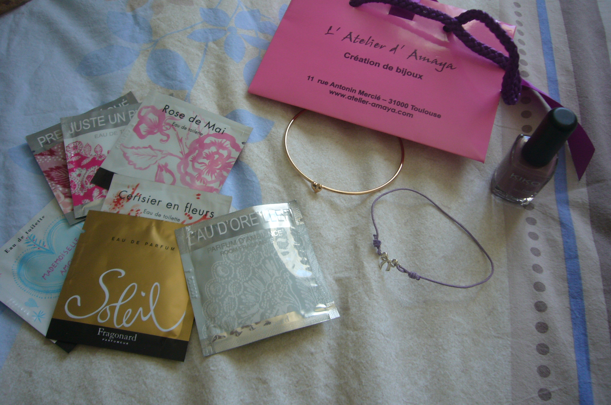 Le thème de la chick-lit a été totalement représenté par ces deux bracelets vraiment jolis (un coeur et un noeud, je craque !), un vernis Kiko (la couleur est juste parfaite, j’adore !! Je sens qu’il ne va pas quitter mes ongles !!) -voir photos ci-dessous- et un ensemble de petits échantillons de parfum et de senteurs : j’ai particulièrement hâte de tester celle pour les oreillers, car je n’ai jamais essayé et j’ai toujours eu envie de le faire, merci donc à Aurélie de m’avoir gâté à ce point, je vais pouvoir prendre bien soin de moi !