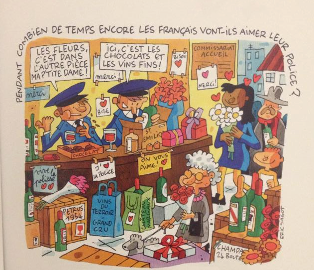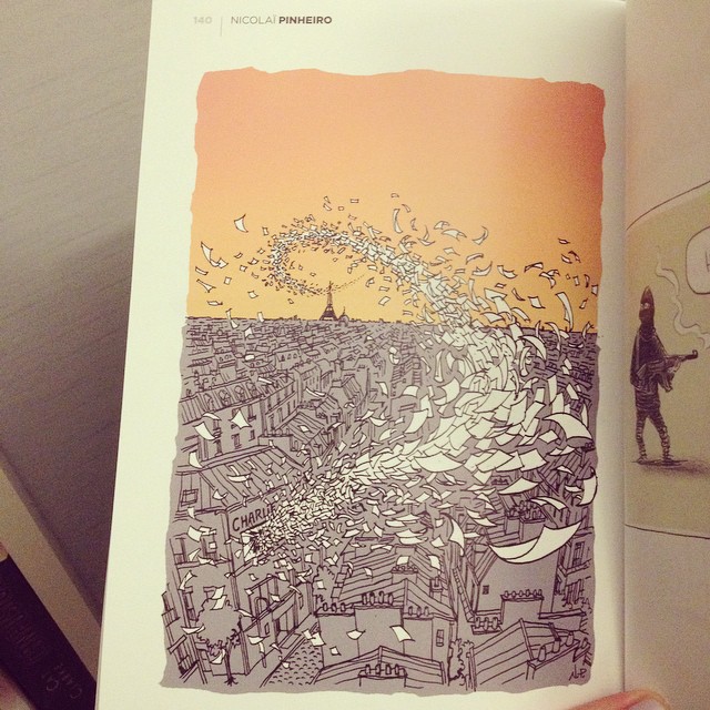 J’ai l’impression que des mots sont superflus, car l’intérêt, tout l’intérêt même est de regarder les dessins, de les observer et d’en extraire les messages qu’ils contiennent. Ce recueil est tout simplement magnifique, il réussit à nous faire rire comme à nous faire frissonner ou encore pleurer, sans doute en raison de la sensibilité qui nous frappe encore tous quand on aborde le sujet des récents attentats.