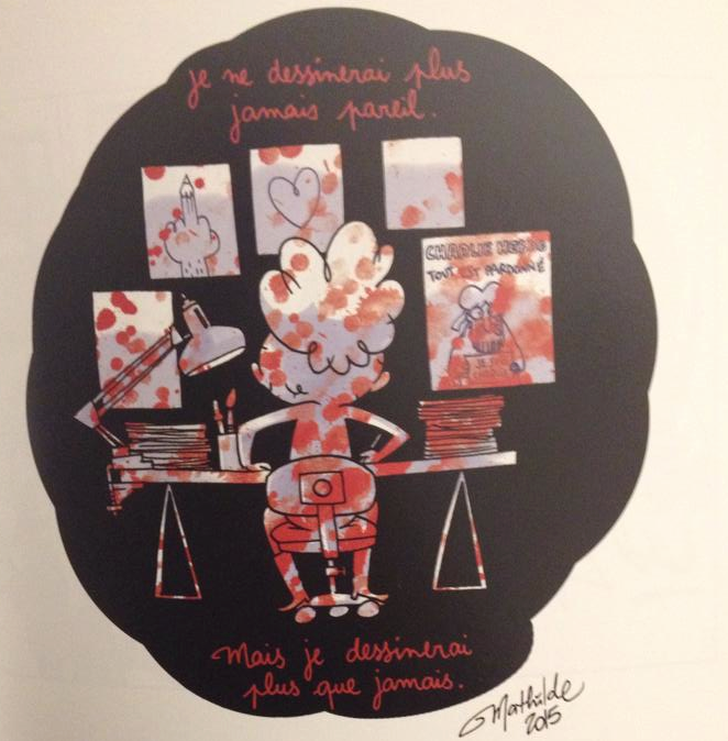 Je ne peux que vous conseiller ce recueil. Il est de ceux que l’on garde pour toujours dans sa bibliothèque, que l’on réouvre aussi parfois. Il est, je crois, la bonne réponse qu’il était possible d’apporter à la violence. Merci à tous les dessinateurs d’y avoir contribué, d’avoir exprimé leur liberté, leur tristesse et leur souffrance d’une façon toute particulière, et d’avoir rendu un si bel hommage à Charlie Hebdo.