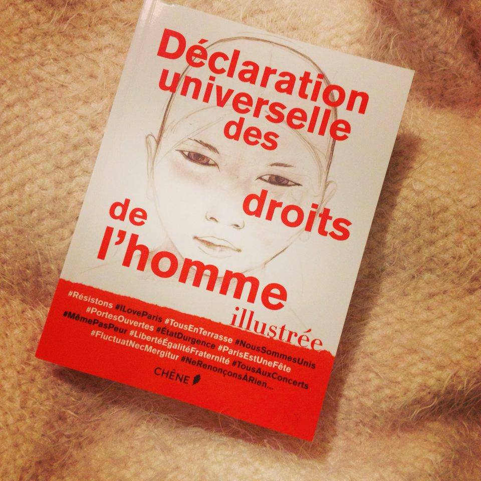 Début 2015, en réaction à l’attentat de Charlie Hebdo, les Éditions du Chêne ont décidé de publier la Déclaration universelle des droits de l’homme en beau livre illustré. Le propos : relire ces 30 articles capitaux à la lumière d’illustrations qui rappellent l’importance et la force de l’image. Trente-deux artistes contemporains illustrent les 30 articles de la Déclaration universelle des droits de l’homme et donnent corps à ce texte fondamental, pilier de notre patrimoine. Liberté, égalité, éducation, vie privée… Autant de thèmes essentiels également explicités au travers d’une sélection de textes d’écrivains, philosophes ou hommes politiques d’hier et d’aujourd’hui.