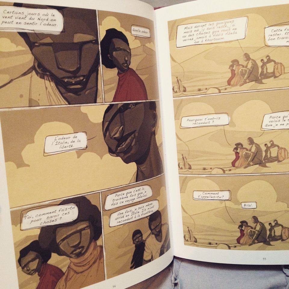 Etenesh est selon moi une lecture indispensable. Parce que l’on parle quotidiennement des migrants, du nombre de personnes qui tentent de venir en Europe, de tous ceux qui sont retrouvés en mer, souvent morts. Qui échouent au large de nos côtes. Nous entendons tout cela, nous voyons ces personnes en image, sans leur donner de nom, sans connaître leur histoire. Cette bande dessinée nous permet de comprendre un peu plus encore ce que ces personnes traversent. Nous ne pouvons en effet pas prétendre que nous savons, que nous avons conscience de ce qu’ils vivent au cours de leur voyage. Ce n’est pas vrai. Je crois qu’il est impossible de le réaliser sans lire et sans réellement se documenter sur le sujet.