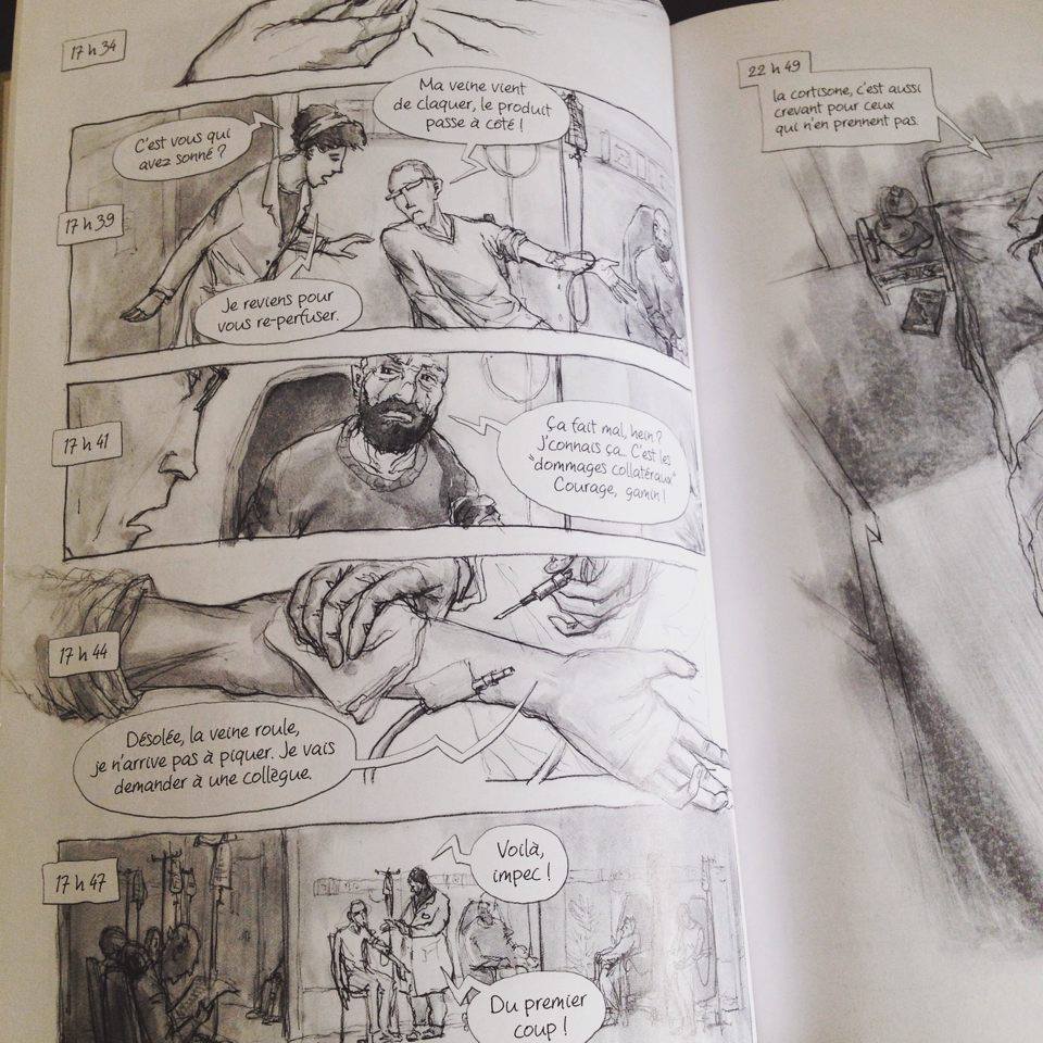 4. A la décharge des auteurs, il est vrai que cette maladie est tellement pénible qu’elle peut nous conduire dans des abîmes de colère et de noirceur dont il est parfois difficile de s’extraire. La BD rend peut-être un peu trop efficacement cette réalité. C’est toute la complexité de l’exercice quand on veut faire comprendre la réalité de cette maladie souvent invisible aux personnes qui n’en sont pas atteintes. Comment ne pas les en détourner si l’on est vraiment très réaliste ? Et en même temps, comment alors l’être suffisamment pour que la maladie ne soit pas alors perçue comme une maladie somme toute assez banale, finalement pas si dure à vivre (alors qu’elle est bel et bien, avec une amplitude variable selon les patients et les jours) ? Exercice périlleux.