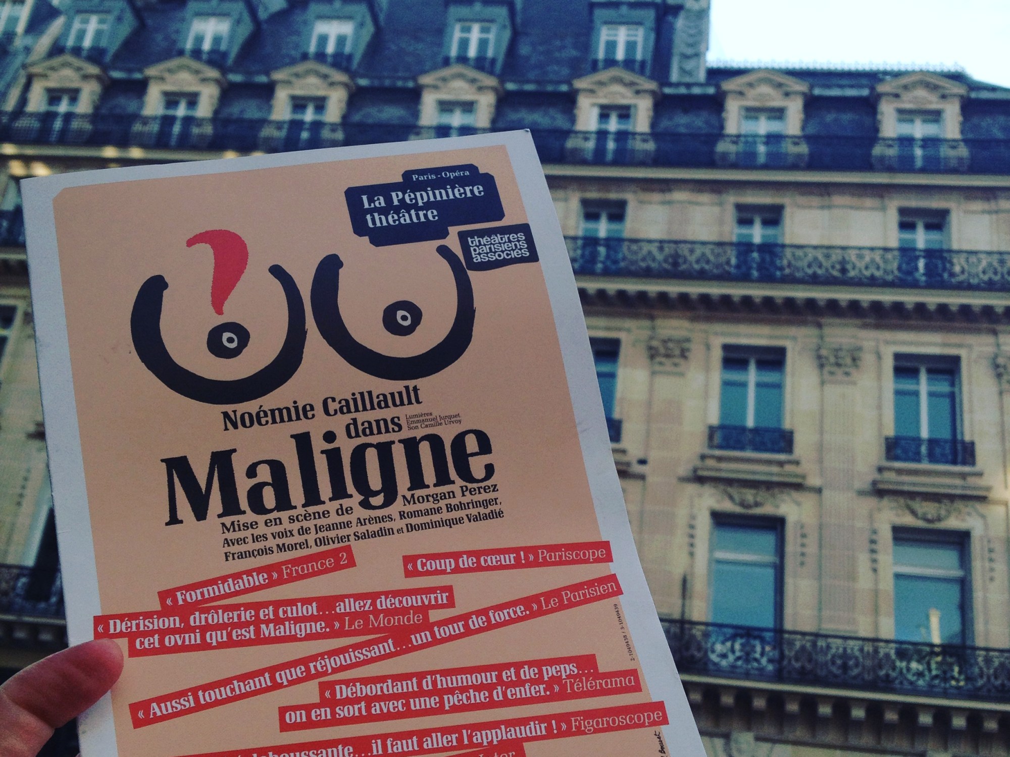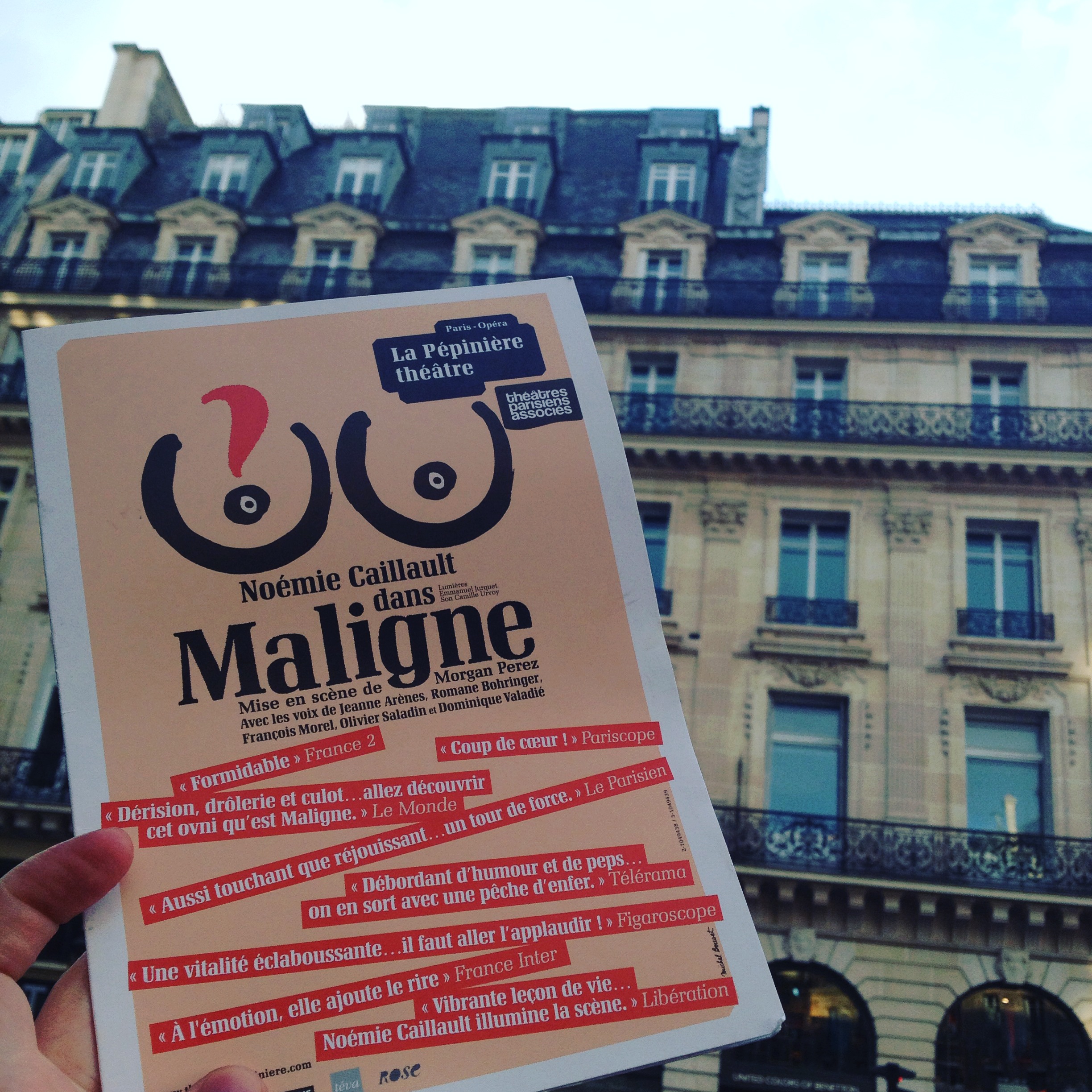Il y a quelques temps, je vous parlais de Maligne, cette pièce de théâtre que je rêvais de voir et que j’avais acheté en format livre pour la découvrir. Ce fut une lecture marquante pour moi et l’envie de la voir jouée sur scène était donc encore plus grande. A ma grande surprise, j’ai pu enfin la voir grâce à ma venue sur Paris et je tiens à remercier très sincèrement Noémie Caillault de nous avoir accueillie si chaleureusement, Carnet Parisien et moi, et de nous avoir permis de voir cette pièce merveilleuse. Il s’agissait, en plus, de la toute dernière représentation au Théâtre de la Pépinière, et c’était donc un soir rempli d’émotions.
