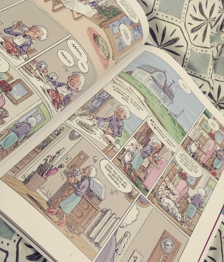 Il n’est pas fréquent de lire une BD qui se déroule en Normandie, et j’ai apprécié cette originalité. Nous rencontrons Madeleine, 95 ans, aveugle, qui vit seule avec son chat, dans sa maison au bord d’une falaise. Jour après jour, c’est la même rengaine : la falaise menace dangereusement de s’effondrer, sans que Madeleine change pour autant quoi que ce soit à ses habitudes. Elle vit sa vie, avec Jules, son mari disparu en mer des années plus tôt. Elle lui prépare son repas, lui parle chaque jour, comme s’il était toujours en vie.