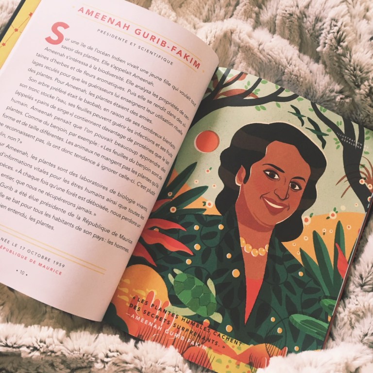 J’ai adoré les illustrations, très différentes les unes des autres, et (chose importante) réalisées par des femmes ! La mise en page du livre est sublime et en fait un très très bel objet de collection. Concernant les portraits de femme choisis, ils m’ont tous semblé très pertinents. On y trouve des profils très variés, à des époques très différentes, et je crois vraiment que chaque enfant saura trouver un portrait de femme en laquelle il se reconnaitra et qui saura l’inspirer. Qui lui donnera envie de croire que tout est possible et qu’il peut lui aussi réaliser ses rêves les plus fous. Pour ma part, j’ai adoré découvrir toutes ces femmes et je suis heureuse de les connaitre désormais. J’ai déjà hâte que le tome 2 soit traduit, mon seul petit regret étant quand même l’omniprésence de portraits de femmes américaines. Sans remettre en cause leur importance, je crois que ce livre aurait pu être encore plus universel en représentant un peu mieux d’autres régions du monde et les femmes extraordinaires de ces différents pays.