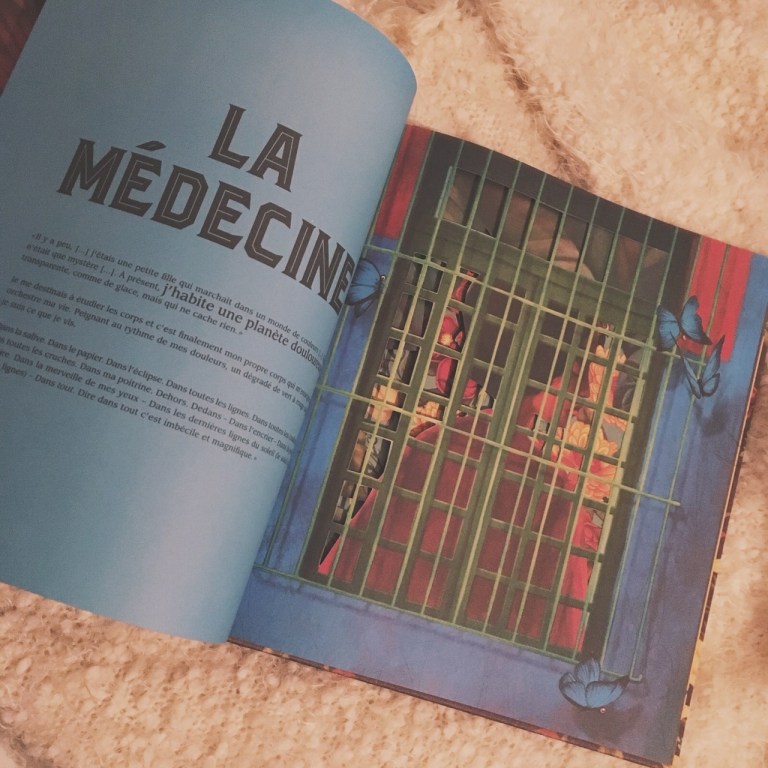Je n’ai donc pas été déçue par ce livre qui est vraiment unique, qui est comme une expérience à vivre, et qui nous ouvre quelques fenêtres sur la vie et l’oeuvre de Frida Kahlo. On a une envie après la lecture : continuer à découvrir l’artiste, aller voir ses toiles, se renseigner encore plus sur elle, et puis, bien entendu, lire encore du Benjamin Lacombe car ce n’est pas si fréquent de trouver autant de talent dans un seul et même homme. Un artiste de génie qui ne cesse de me surprendre et que je commence tout juste à découvrir.