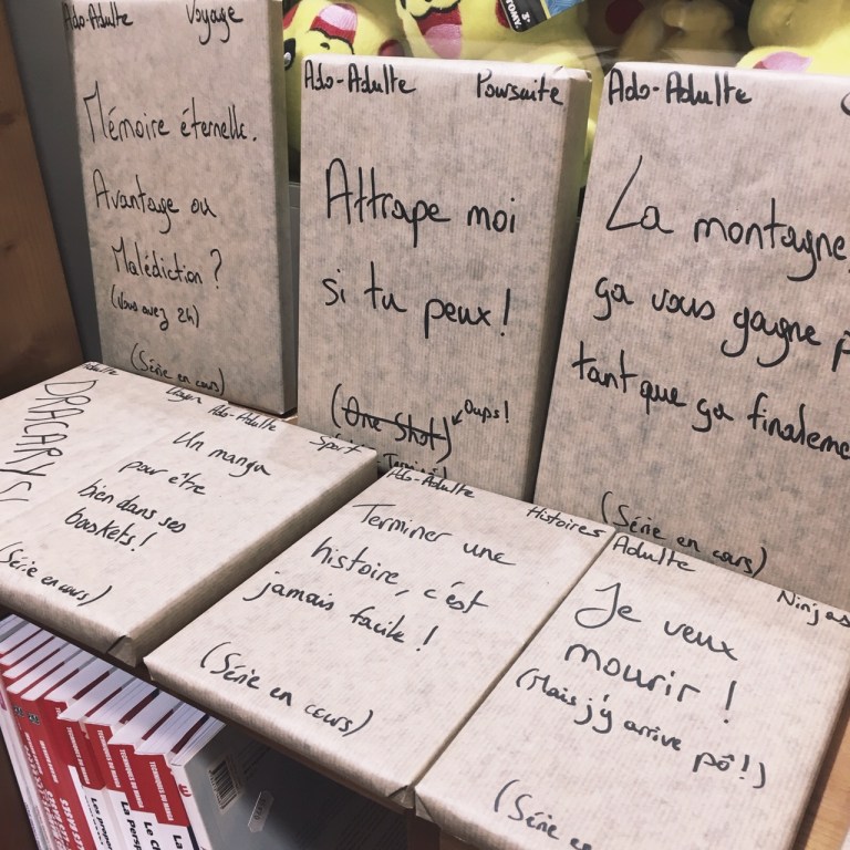 Autre petit point qui me plait beaucoup : leurs coups de coeur sont mis en avant, par des petites étiquettes et logos précisant quel libraire a aimé ce titre. C’est toujours un gros plus quand les libraires rendent leurs coups de coeur vivants, apparents, et cela ne peut que nous encourager à faire de belles découvertes. Le concept de pochettes à livres, permettant d’acheter un titre à l’aveugle, simplement sur quelques indices, m’a également beaucoup plu ! J’adore ce genre d’initiatives, c’est ce que je recherche quand je visite une librairie.