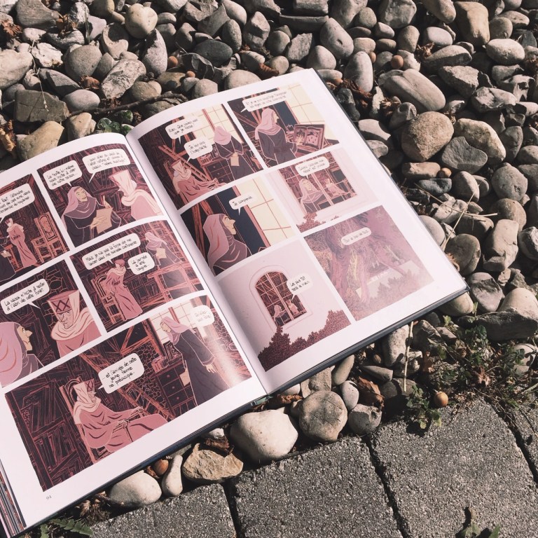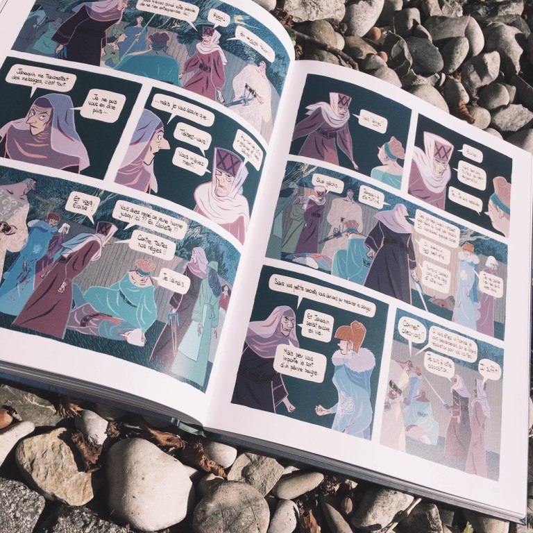 Quand on sait que cet ouvrage coûte 32€, on comprend pourquoi. Vraiment. C’est une oeuvre extraordinaire qui se lit en détaillant chaque page minutieusement, pendant de longues minutes. Au-delà d’en apprécier l’histoire, c’est tout le travail d’illustration qui nous émerveille et qui en fait une BD comme on en lit peu. J’ai adoré cette lecture qui m’a envoutée et transportée. C’est une histoire dont le contexte s’inspire fortement du Moyen-Age, du temps des chevaliers et des royaumes. Pour autant, ce n’est pas réellement un récit seulement historique puisqu’il y a un peu de fantasy dans cette histoire qui en fait une sorte de conte pour adulte, à l’image des contes qu’on lisait quand on était enfants.