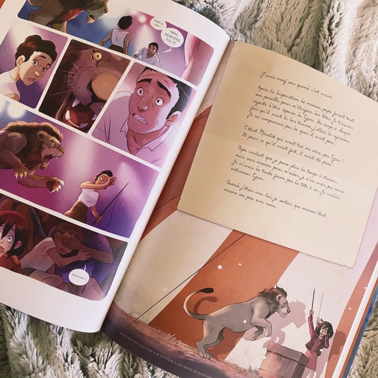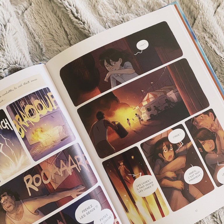 Les dessins d’Aurélie Neyret sont toujours magiques et c’est assez inexplicable comme ils me transportent toujours immédiatement. J’ai donc plongé dans cette histoire avec enthousiasme et j’y ai découvert, au départ, un contexte que je n’apprécie pas vraiment, à savoir celui du cirque et des animaux en captivité. Pourtant, j’étais curieuse car cette bande dessinée nous décrit une époque, et je savais que ça allait rendre cette histoire plus riche encore.