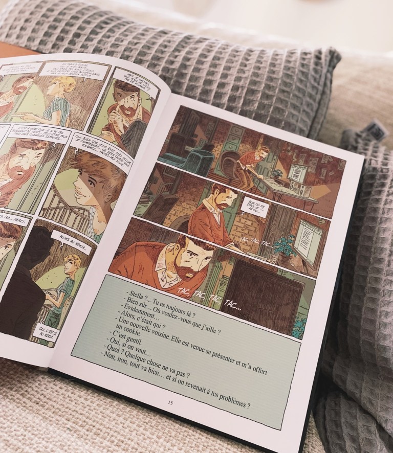 En général, ce sont d’abord les dessins qui m’attirent vers une bande dessinée. Je sens qu’ils correspondent à ma sensibilité, et j’ai aimé la sensualité et les couleurs de la couverture de Stella. Cela m’a rendue très curieuse de la lire, n’ayant d’ailleurs jamais lu d’ouvrage de Cyril Bonin jusqu’à présent. Le début m’a bien plu puisque nous rencontrons un auteur qui cherche l’inspiration et qui s’adresse à son personnage principal à travers son clavier, en espérant trouver des idées pour la suite de ses aventures. Ce personnage, c’est Stella. Et ce qu’il n’avait pas imaginé, c’est qu’elle allait prendre vie et débarquer un jour sur son palier.