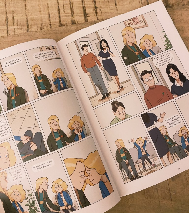 Cette BD a été pour moi une véritable surprise, complètement inattendue. Quand nous rencontrons Phénix, elle est avec sa soeur au bord de la route, et elles vont monter à bord du véhicule de son professeur d’anglais. Celui-ci va les ramener chez elles, et rencontrer leur mère. Puis, petit à petit, il va s’inviter dans leur quotidien quand il va nouer une relation avec cette dernière. Les deux soeurs sont très proches, fusionnelles même. Leur père est parti depuis plusieurs mois et leur mère n’est pas très présente. Ensemble, elles se serrent les coudes et Phénix joue pour sa soeur le rôle de seconde maman. Leur relation est si belle et douce qu’elle m’a beaucoup touchée.