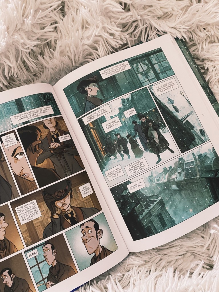 C’est une BD absolument envoutante de par ses dessins et son atmosphère. On est plongé immédiatement dans ce Londres brumeux, sombre, où la pauvreté règne. On s’y croirait véritablement, et c’est une sensation que j’ai adorée à la lecture. Il est appréciable également que malgré tous les messages transmis par l’histoire, le personnage reste malgré tout fidèle à lui-même. Cela rend l’ensemble encore plus crédible à mon sens. Les couleurs sont incroyables, les dessins somptueux, et l’ensemble est tout simplement magnifique, même si ce n’est pas la magie de Noël telle qu’on pourrait l’attendre, mais plutôt un texte très sombre.